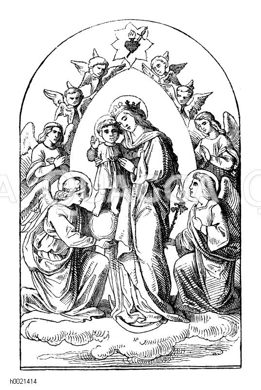 Madonna mit dem Kind, umgeben von Engeln: Zeichnung/Illustration/Holzstich – – Madonna with the child, surrounded by angels – Madonna avec l’enfant, entouré d’anges