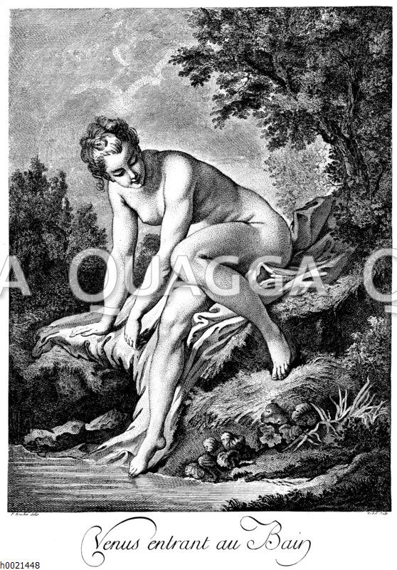 Die badende Venus. Französischer Kupferstich von J.B. Michel nach F. Boucher um 1770 Zeichnung/Illustration/ – – The Bathing Venus. French engraving by JB Michel after F. Boucher 1770 –