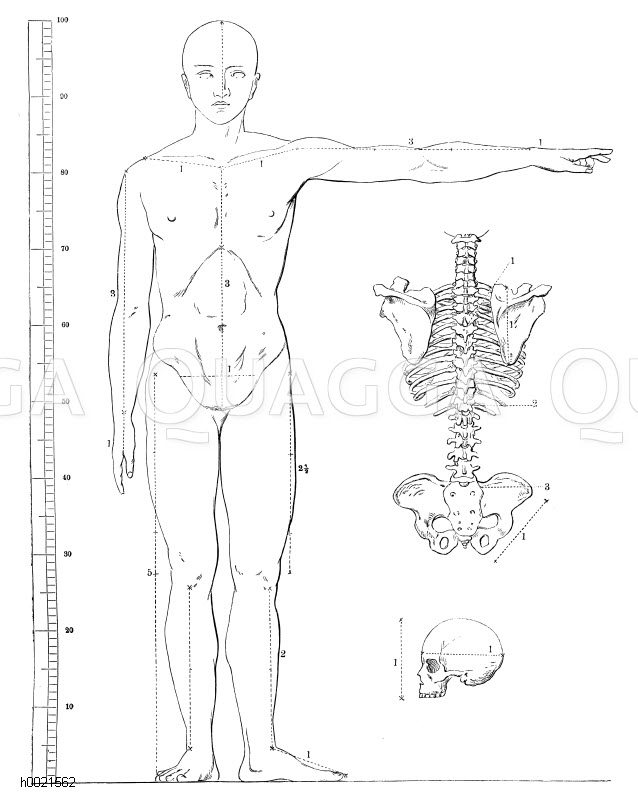 Kanon der menschlichen Gestalt (nach Carus-Rietschel): Zeichnung/Illustration/Holzstich – – Proportions of the human figure (after Carus Rietschel ) –