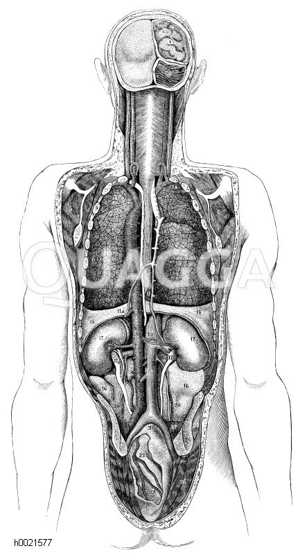 Rückenansicht der Brust- und Baucheingeweide: Zeichnung/Illustration/Holzstich – – Back view of the thoracic and abdominal viscera –