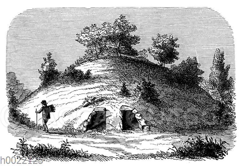 Schwedischer Tumulus mit zwei Gang-Grabkammern: Zeichnung/Illustration/Holzstich – – Swedish tumulus with two passage burial chambers – Tumulus suédois avec deux chambres funéraires à couloir