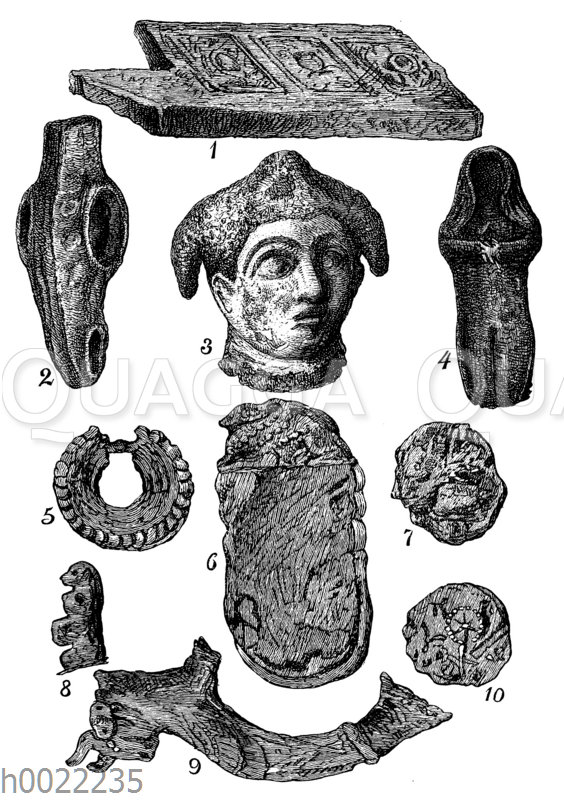 Babylonische Altertümer. 1 Türschwell vom Palast Nebukadnezar, 2 u. 4 Äxte, 3 steinerner Kopf, 5 silbernes Ornament, 6 Stein mit sphinxähnlicher Figur, 7 u. 10 Münze (Vorder- und Rückseite), 8 Figur eines Affen, 9 silberner Henkel von einem Trinkgefäß
