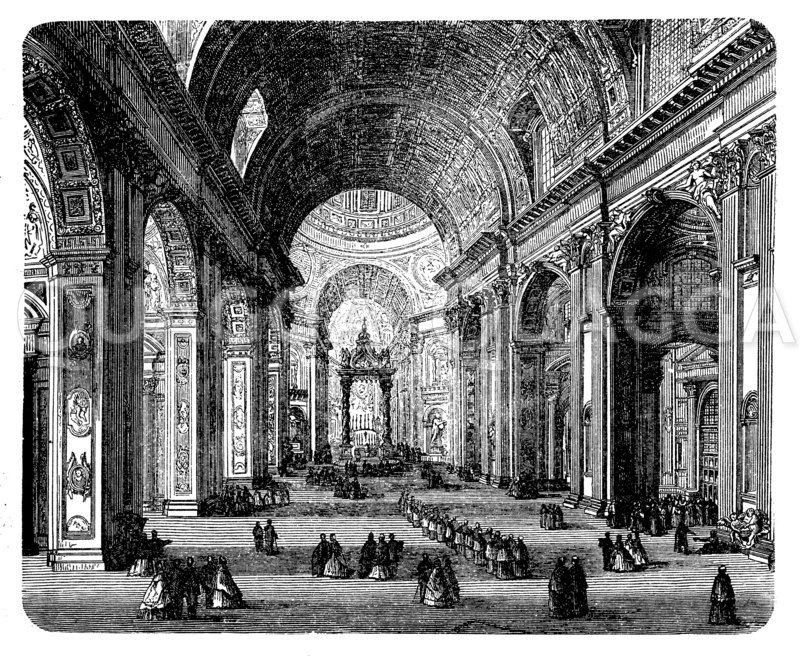 Peterskirche: Innenansicht: Zeichnung/Illustration/Holzstich – – Peterskirche: Interior view – Peterskirche: vue intérieure