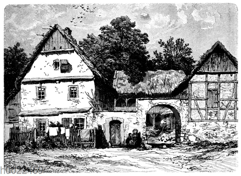 Thüringer Bauernhof bei Weimar: Zeichnung/Illustration/Holzstich – – Thuringian farm near Weimar – Ferme de Thuringe près de Weimar