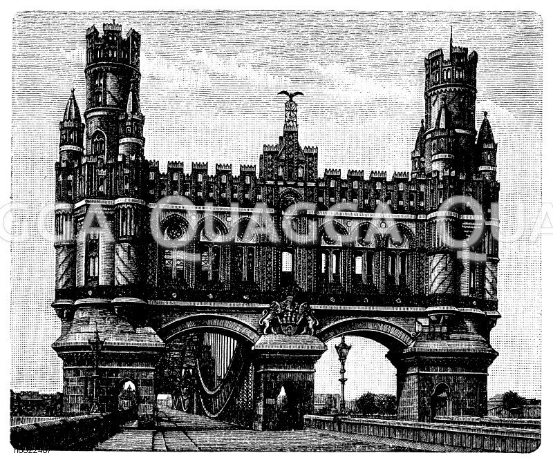 Portal der Straßenbrücke über die Nordelbe bei Hamburg: Zeichnung/Illustration/Holzstich – – Portal of the road bridge over the Nordelbe near Hamburg – Portail du pont routier sur le Nordelbe près de Hambourg