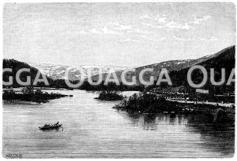 Flusssee in Telemarken: Zeichnung/Illustration/Holzstich – – River lake in Telemarken – Lac fluvial de Telemark