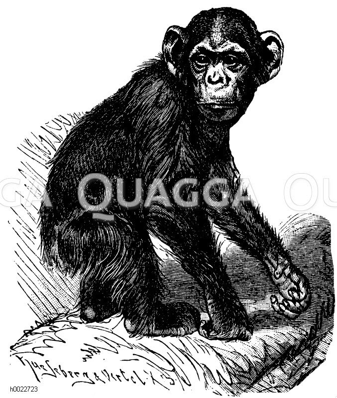 Schimpanse: Zeichnung/Illustration/Holzstich – Pan troglodytes – Chimpanzee – Chimpanze