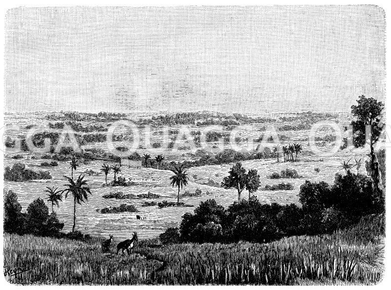 Äquatorialafrikanische Savanne: Zeichnung/Illustration/Holzstich – – Equatorial African Savannah – Savane équatoriale africaine