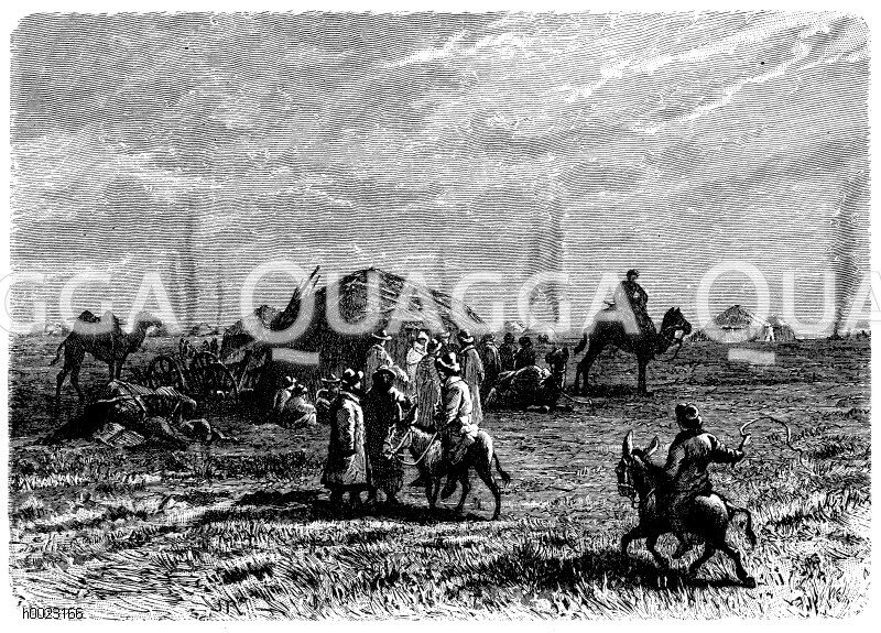 Kirgisenlager in der Turanischen Steppe: Zeichnung/Illustration/Holzstich – – Kyrgyz camp in the Turanian steppe – Camp kirghize dans la steppe turanienne