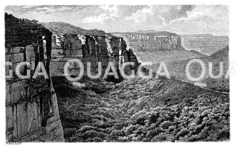 Blaue Berge in Neusüdwales: Zeichnung/Illustration/Holzstich – – Blue Mountains in New South Wales – Blue Mountains en Nouvelle-Galles du Sud