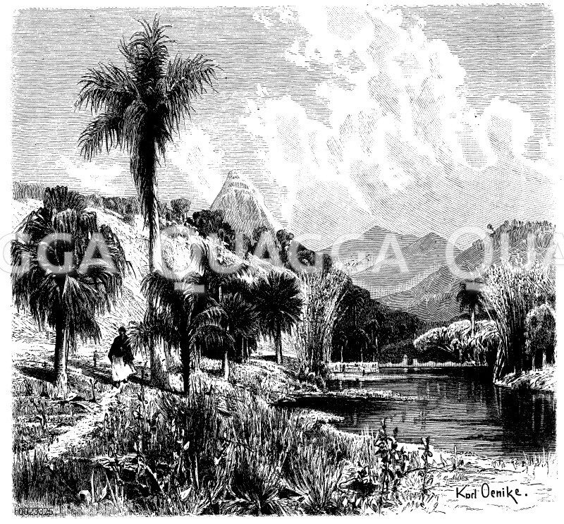 Flussvegetation bei Tijnca, Brasilien: Zeichnung/Illustration/Holzstich – – River vegetation near Tijnca, Brazil – Végétation fluviale près de Tijnca, Brésil