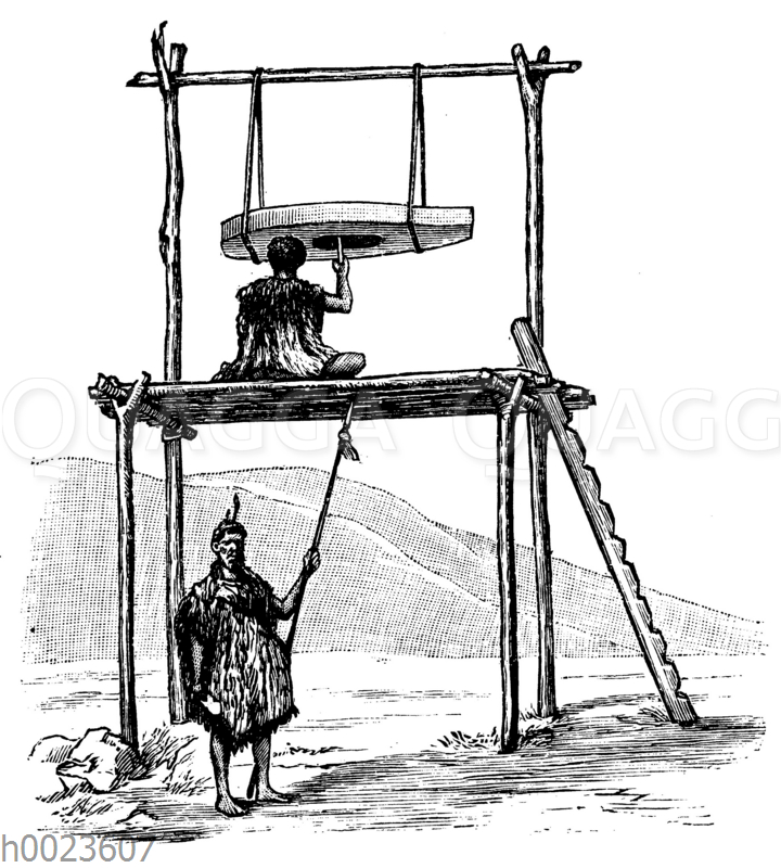 Kriegspauke, Neuseeland: Zeichnung/Illustration/Holzstich – – War timbal, New Zealand – War timbale, Nouvelle-Zélande