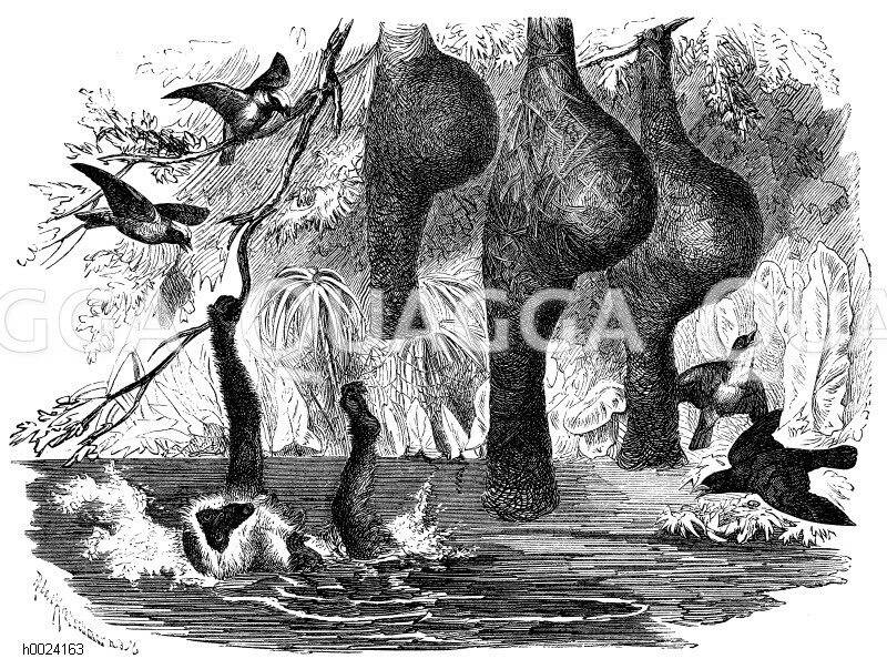 Südafrikanische Webervögelnester: Zeichnung/Illustration/Holzstich – – –