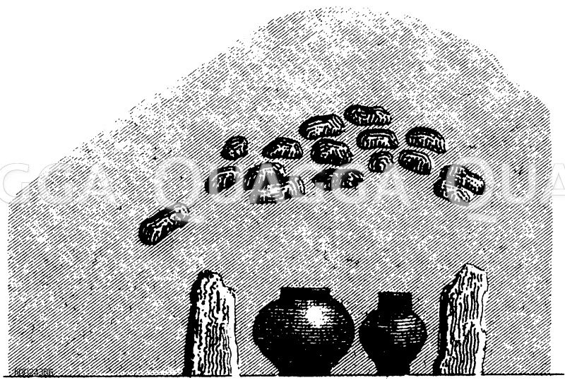 Hügelgrab mit Aschenurnen: Zeichnung/Illustration/ – – Hill grave with ash urns – Tombe de colline avec des urnes à cendres