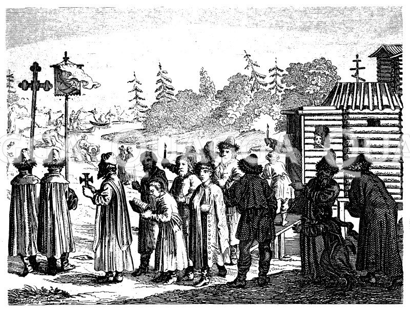 Russische Wasserweihe und Taufe: Zeichnung/Illustration/ – – Russian water consecration and baptism – Consécration de l’eau russe et baptême