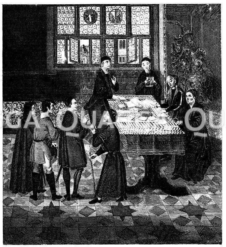 Folterwerkzeuge und Strafwerkzeuge. Gerichtsstube (15. Jahrhundert): Zeichnung/Illustration/ – – Tools of torture and punishment. Courtroom (15th century) – Outils de torture et de punition. Salle d’audience (XVe siècle)