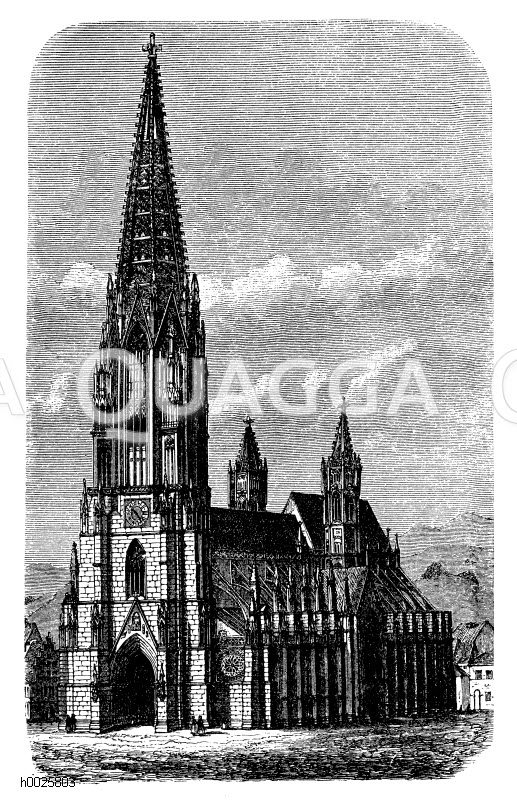 Münster zu Freiburg in Baden: Zeichnung/Illustration/Holzstich – – Cathedral at Freiburg in Baden – Cathédrale de Fribourg-en-Brisgau