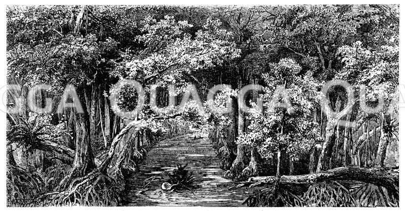 Kanal im Mangrovensumpf auf Ponape (Karolinen): Zeichnung/Illustration/Holzstich – Rhizophora mangle – Channel in the mangrove swamp on Ponape ( Caroline ) – Palétuvier
