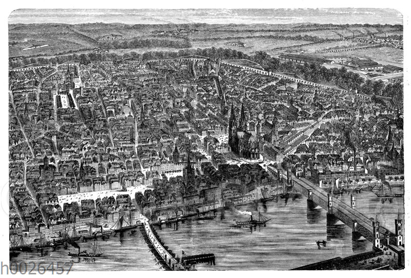 Köln aus der Vogelperspektive: Zeichnung/Illustration/Holzstich – – Bird’s eye view of Cologne – Cologne vue du ciel