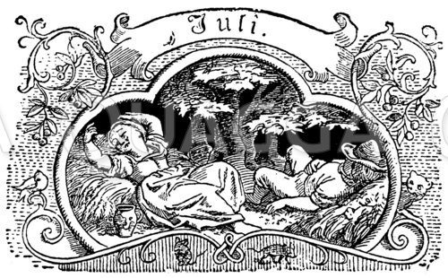 Vignette: Juli: Zeichnung/Illustration/Holzstich – – –