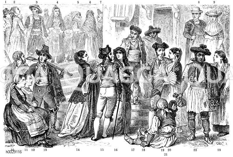 Spanische Volkstrachten. 1, 4 Leon, 2, 3, 10, 13 Altkastilien. 5-7, 14, 16, 18, 20-23 Valencia. 8, 9 Mallorca, 11. Biskaya. 12 Vigo (Galizien). 15, 19 Toreros (Stierkämpfer). 17 Andalusien: Zeichnung/Illustration/Holzstich – – –