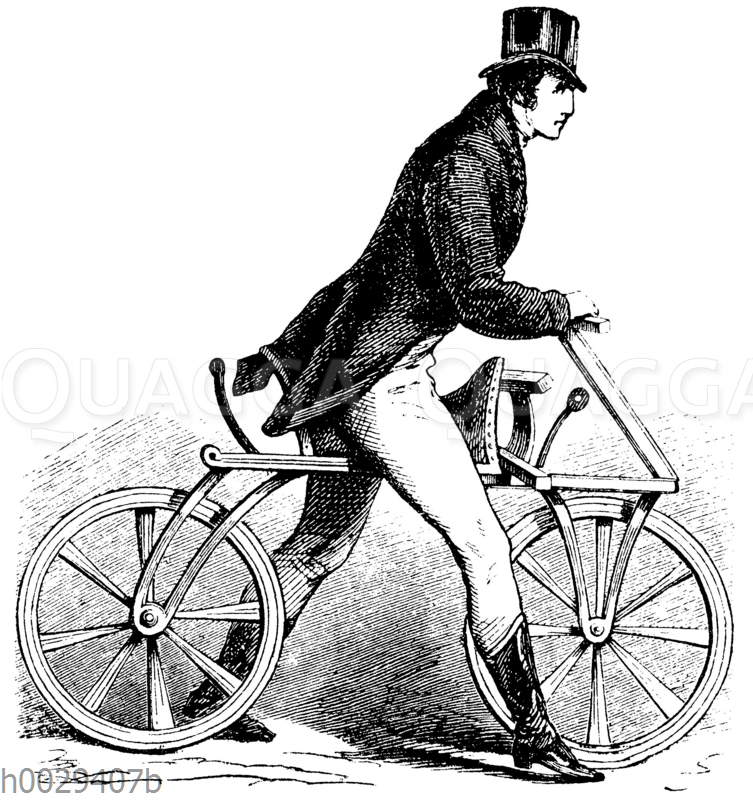 Laufmaschine des Herrn von Drais, Draisine: Zeichnung/Illustration/Holzstich – – Running machine of the Lord of Drais, Draisine – Machine de course du seigneur de Drais, Draisine