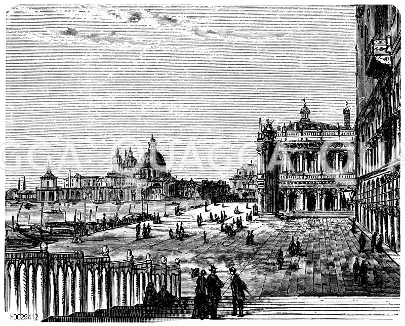 Piazzetta und die Kirche Santa Maria della Salute zu Venedig: Zeichnung/Illustration/Holzstich – – Piazzetta and the Church of Santa Maria della Salute in Venice –