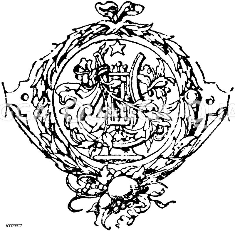 Embleme der Malerei, Bildhauerei ect: Handzeichnung von Dir. Götz in Karlsruhe. Vom Titel zu einer Goethe-Ausgabe.: Zeichnung/Illustration/Holzstich – – –