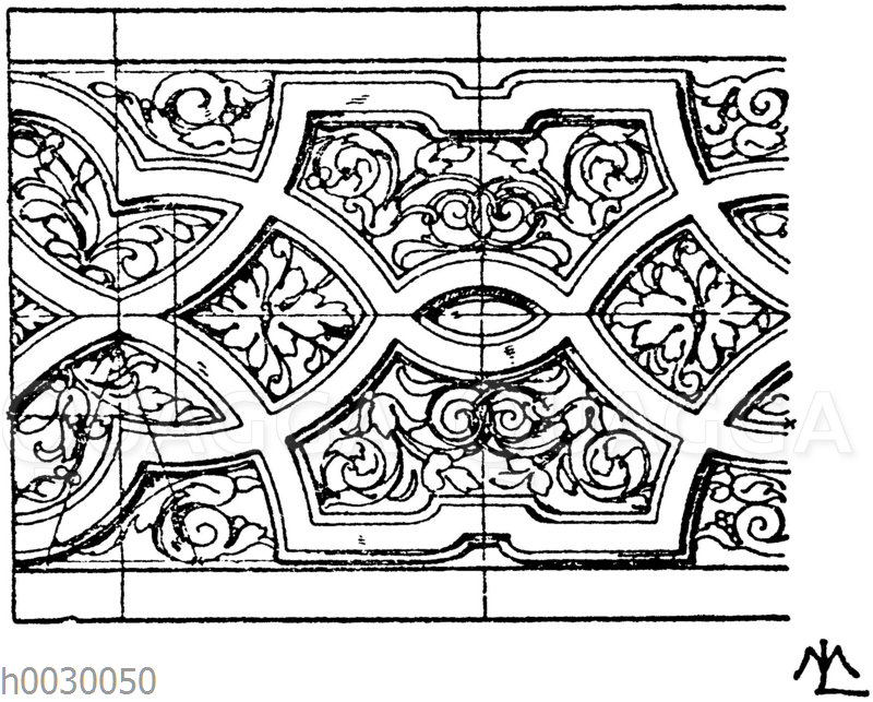 Leibungsornament vom Eingang des Otto-Heinrichbaues zu Heidelberg, 1556 bis 1559. (Musterornamente): Zeichnung/Illustration/Holzstich – – Soffit ornament from the entrance of the Otto-Heinrich building at Heidelberg_ 1556 to 1559. (Pattern ornaments). – Ornement d’embrasure de l’entrée du bâtiment d’Otto-Heinrich à Heidelberg _ 1556 à 1559. (Ornements de motifs).
