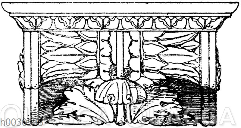 Vorderansicht einer römischen Konsole vom Tempel des Jupiter Stator in Rom. Museum des Vatikan.: Zeichnung/Illustration/Holzstich – – Front view of a roman console from the Temple of Jupiter Stator in Rome. Museum of the Vatican. – Vue de face d’une console romaine du temple de Jupiter Stator à Rome. Musée du Vatican.
