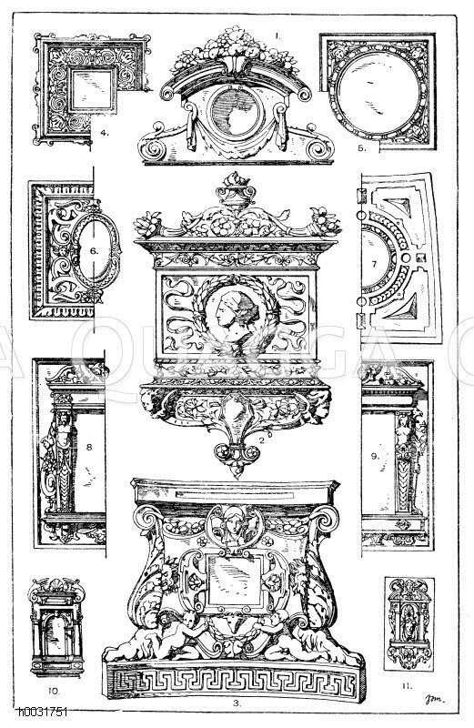 ![Architektonische Rahmen: 1. Umrahmung der Giebelöffnung eines Dachfensters in Rouen Französische Renaissance. 17. Jahrhundert (L'art pour tous). 2. Architektonische Umrahmung im Stil der italienischen Renaissance. 19. Jahrhundert. 3. Sockelpartie mit architektonischem Rahmenornament Italienische Renaissance. Genua. (Owen Jones). 4. Umrahmung einer Türfüllung im Stil der deutschen Renaissance. Ihne und Stegmüller in Berlin. (Architektonisches Skizzenbuch). 5. Umrahmungen einer Ofenkachel. Schloß Wülfingen bei Winterthur. 17. Jahrhundert. (Kunsthandwerk). 6. Umrahmungsornament vom Unterbau eines Meßpultes in S. Giorgio maggiore in Venedig. Italienische Renaissance. 7. Umrahmung einer Kassettenfüllung aus einer Kuppel des Dagobertturmes in Baden-Baden. Deutsche Renaissance. 8.-9. Umrahmungen der Türfüllungen von der Kanzel im Dom zu Magdeburg. Deutsche Renaissance, 1595-97. (Gewerbehalle). 10. Umrahmung von der Tür eines Schrankes im Stil der deutschen Renaissance. (Formenschatz). 11. Umrahmung von der Tür eines Büffettschrankes aus den Sammlungen des Louvre in Paris. Renaissance. [Digital]](https://www.quagga-illustrations.de/wp-content/uploads/2014/05/h0031751.jpg)