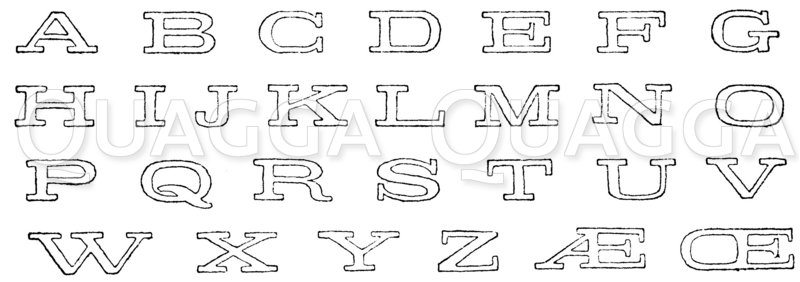 Lateinische Schrift: Alphabet, „breitlaufend-ionisch“, 19. Jahrhundert: Zeichnung/Illustration/Holzstich – – –