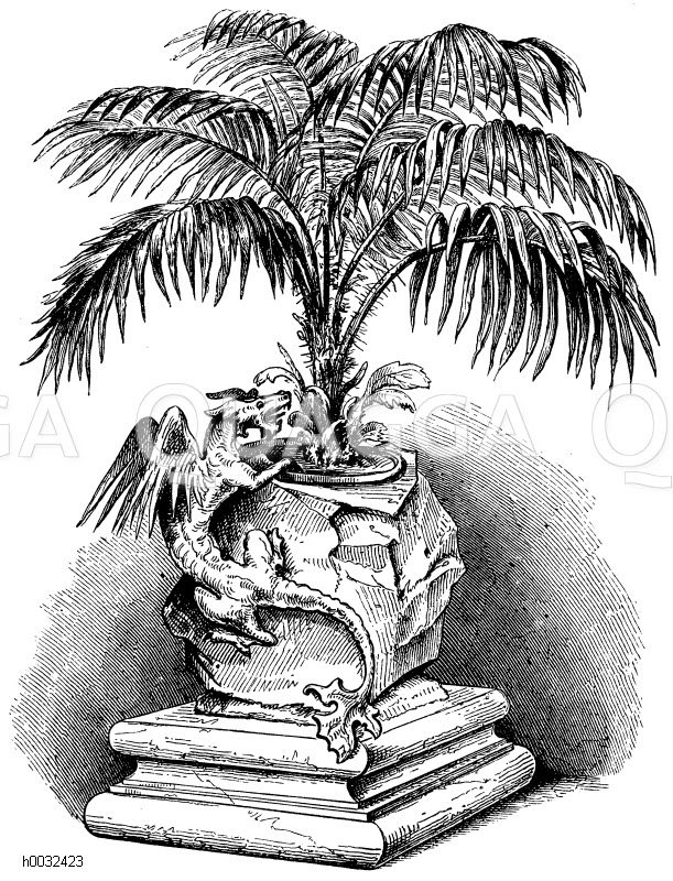 Palme. Prachtpflanze in Behälter mit Drache: Zeichnung/Illustration/Holzstich – – Palm tree. Superb plant in container with dragon –