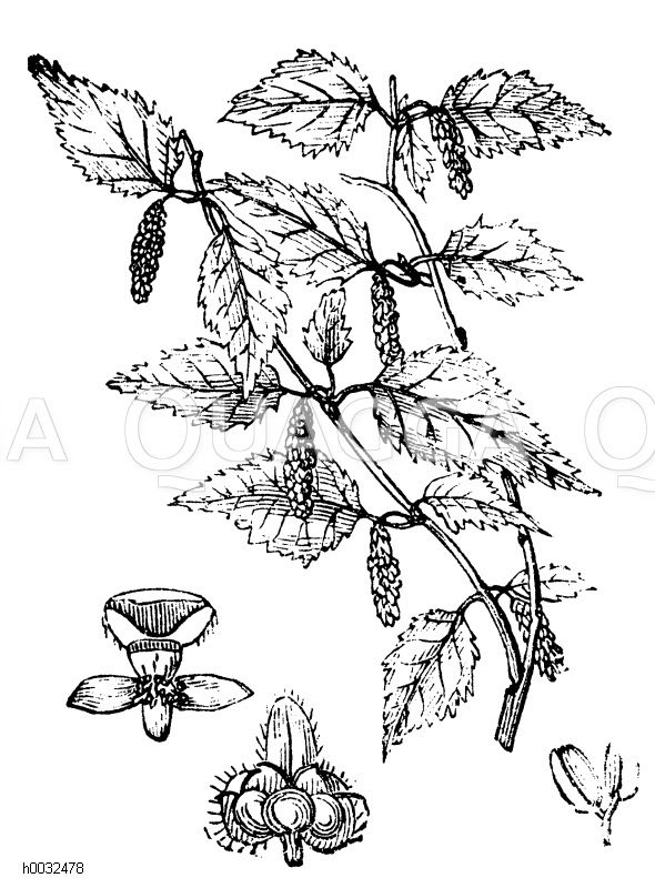 Papierbirke, Amerikanische Weiß-Birke: Zeichnung/Illustration/Holzstich – Betula papyrifera – paper birch – bouleau à papier