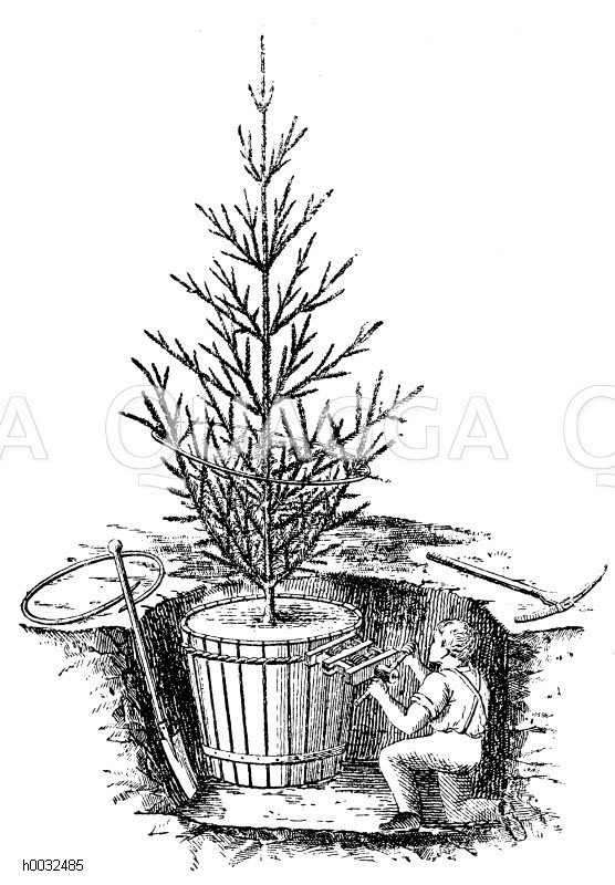 Umgraben von Gehölzen: Zeichnung/Illustration/Holzstich – – Digging up trees with help of a barrel –