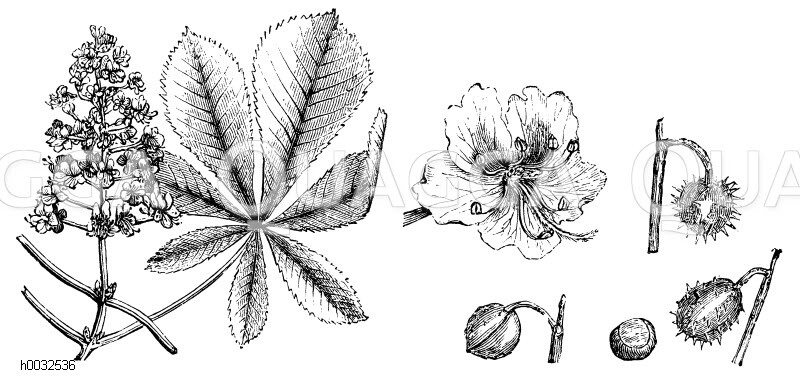 Rostkastanie: Zeichnung/Illustration/Holzstich – Aesculus hippocastanum – horse-chestnut, conker tree (Aesculus hippocastanum) – marronnier commun (Aesculus hippocastanum)