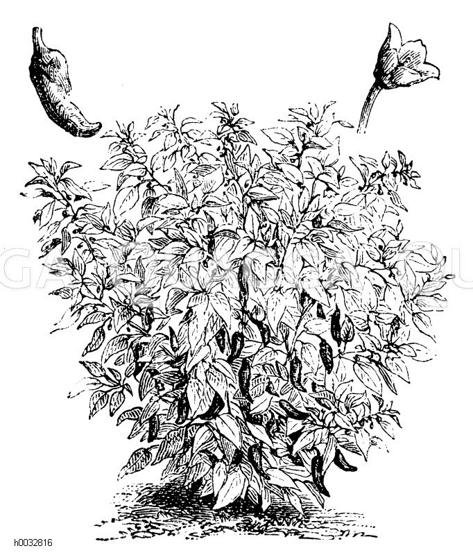 Chili, ‚Lange Beißbeere‘: Zeichnung/Illustration/Holzstich – Capsicum longum – –