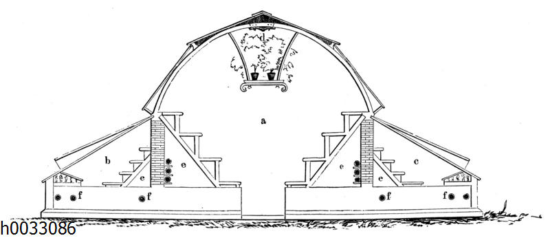 Gewächshauskonstruktion für verschiedenartige Zwecke: Zeichnung/Illustration/ – – Greenhouse construction for various purposes. Sides can be used for propagation of plants – Construction de serres pour différents usages. Les côtés peuvent servir à la multiplication des plantes