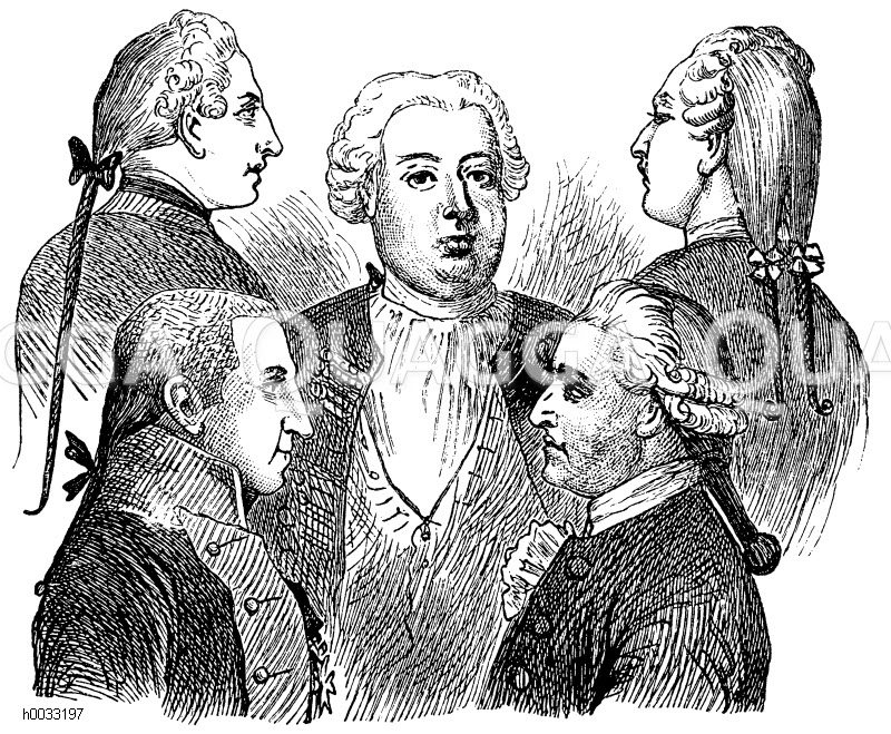 Zopftrachten (in der Mitte König Friedrich Wilhelm I. von Preußen, der Erfinder des Zopfes): Zeichnung/Illustration/Holzstich – – –