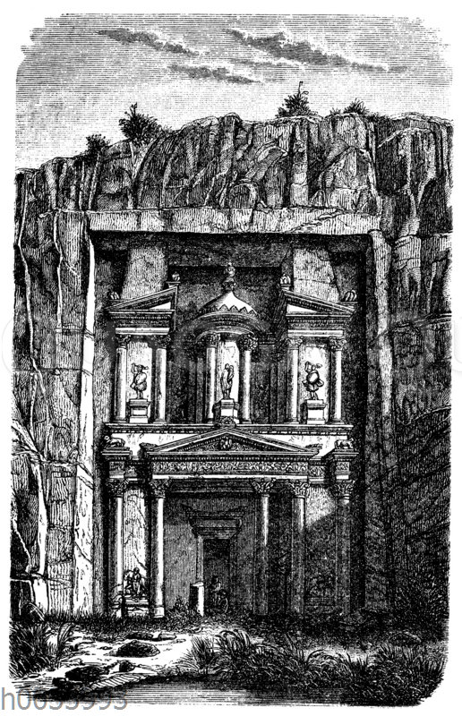 Felsengrab in Petra, genannt Khasné oder Schatzhaus des Pharao; Khazne al-Firaun: Zeichnung/Illustration/Holzstich – – Al-Khazneh, Petra, Jordan