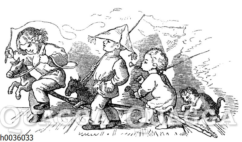 Jungen spielen Soldaten auf Steckenpferden: Zeichnung/Illustration/Holzstich – – Boys playing soldiers on wooden horses –