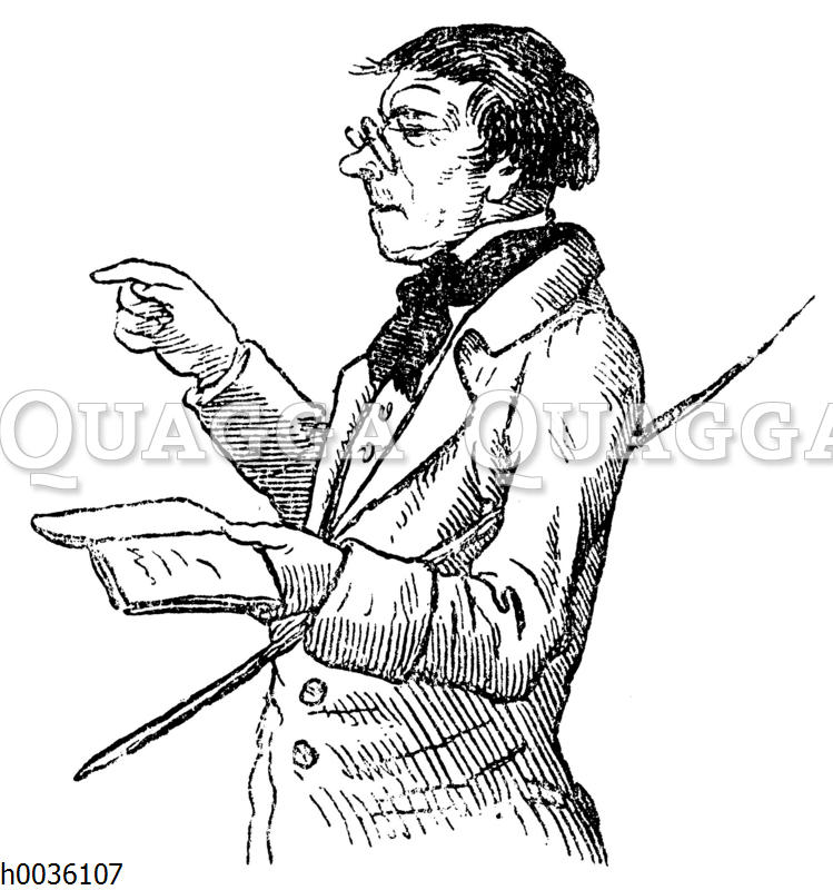 Lehrer mit Rohrstock: Zeichnung/Illustration/Holzstich – – Teacher with cane –