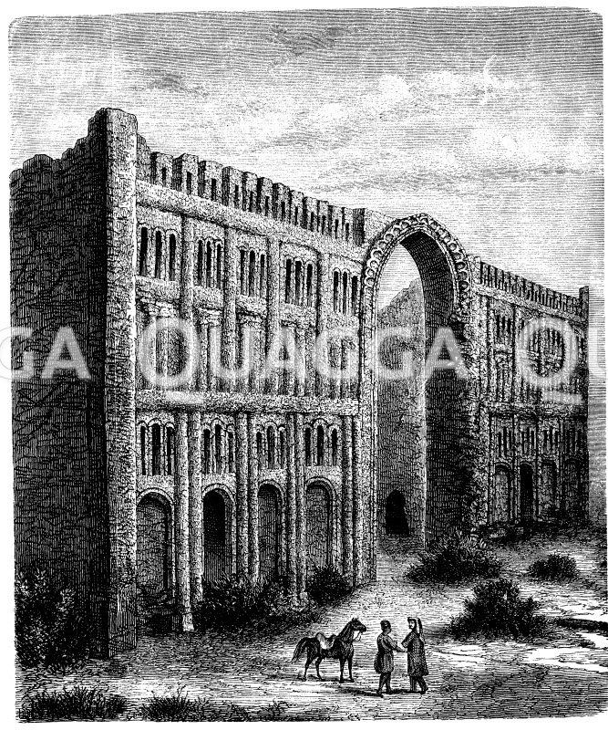 El Kas’r (das Schloss): Mauerruine mit Toreingang von Palast Nebukadnezars: Zeichnung/Illustration/Holzstich – – El Kas’r (the castle): wall ruin with gate entrance of Nebuchadnezzar’s palace where Alexander the Great died) – El Kas’r (le château) : muraille en ruine avec porte d’entrée du palais de Nebucadnetsar où mourut Alexandre le Grand)