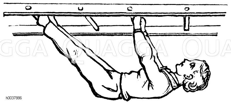 Turnen, Übungen an der Waagerechten Leiter: Liegehang vorl.: Zeichnung/Illustration/Holzstich – – Gymnastics, exercises on the horizontal ladder: Liegehang vorl. – Gymnastique, exercices sur l’échelle horizontale: Liegehang vorl.
