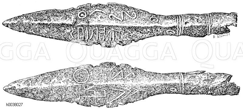 Lanzenspitze mit Runenaufschrift: Zeichnung/Illustration/Holzstich – – –