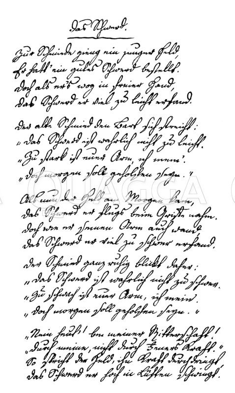 Gedicht ‚Das Schwerd‘ von Ludwig Uhland: Zeichnung/Illustration/Holzstich – – Poem ‚Das Schwerd‘ by Ludwig Uhland. Original owned by the Dame of König-Warthausen in Stuttgart –