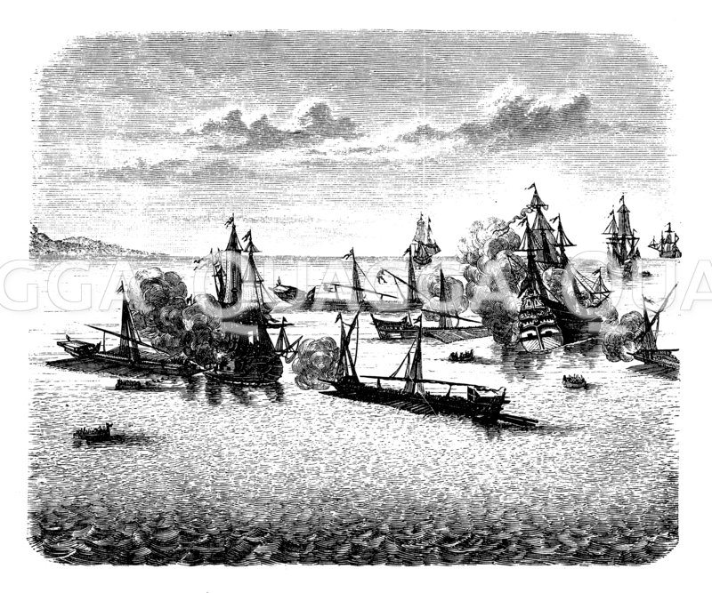 Seegefecht bei Rhodos: Zeichnung/Illustration/Holzstich – – –
