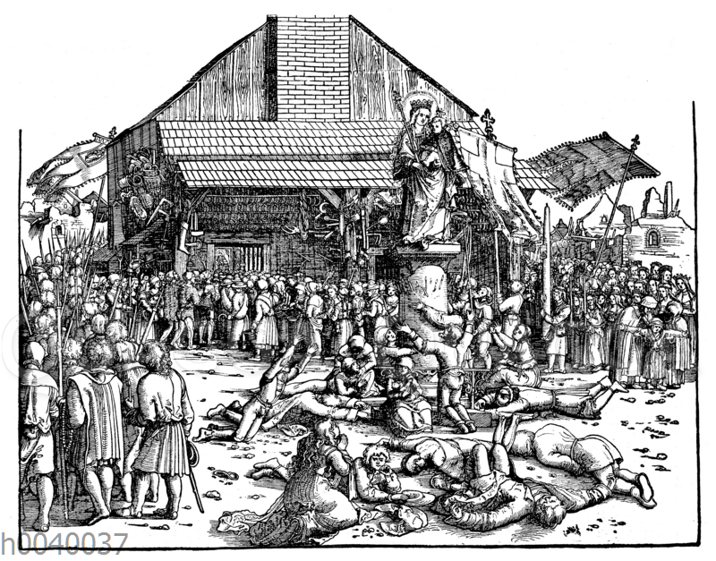 Wallfahrer, die heil. Jungfrau verehrend: Zeichnung/Illustration/Holzstich – – –
