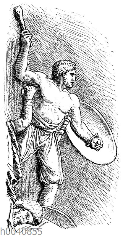 Ein unter den Römern gegen die Daker kämpfender Germane: Zeichnung/Illustration/Holzstich – – A Teuton fighting under the Romans against the Dacians. Relief from Trajan’s Victory Column at Rome – Un Germain combattant les Daces sous les Romains. Relief de la colonne de victoire de Trajan à Rome.