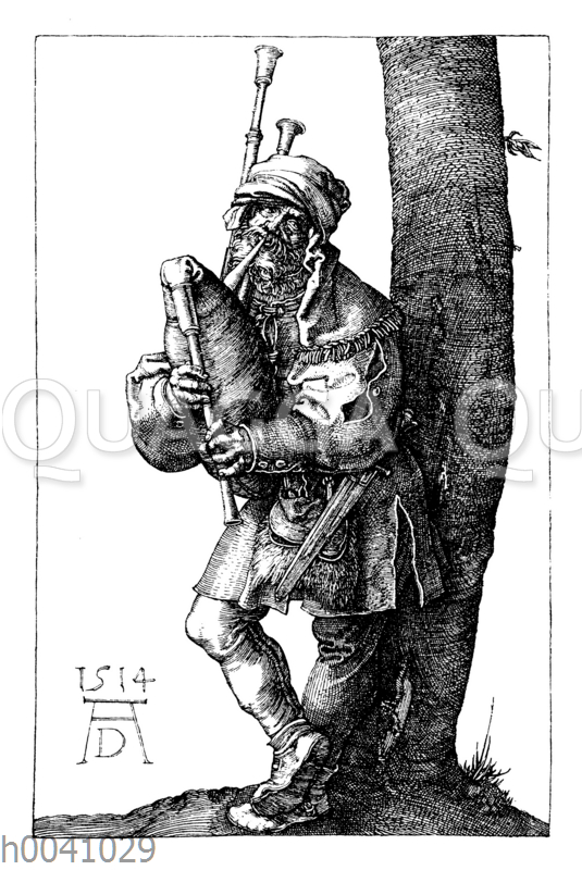 Dudelsackspfeifer. Kupferstich, 1514, von Albrecht Dürer: Zeichnung/Illustration/Holzstich – – –